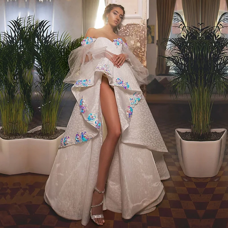 Get Eightale Prom Dresses 2020 Sweetheart Appliques Blue Flowers High Side Split White Ivory Long Sleeve Evening Gown Party Dress only US $89.43 just for today